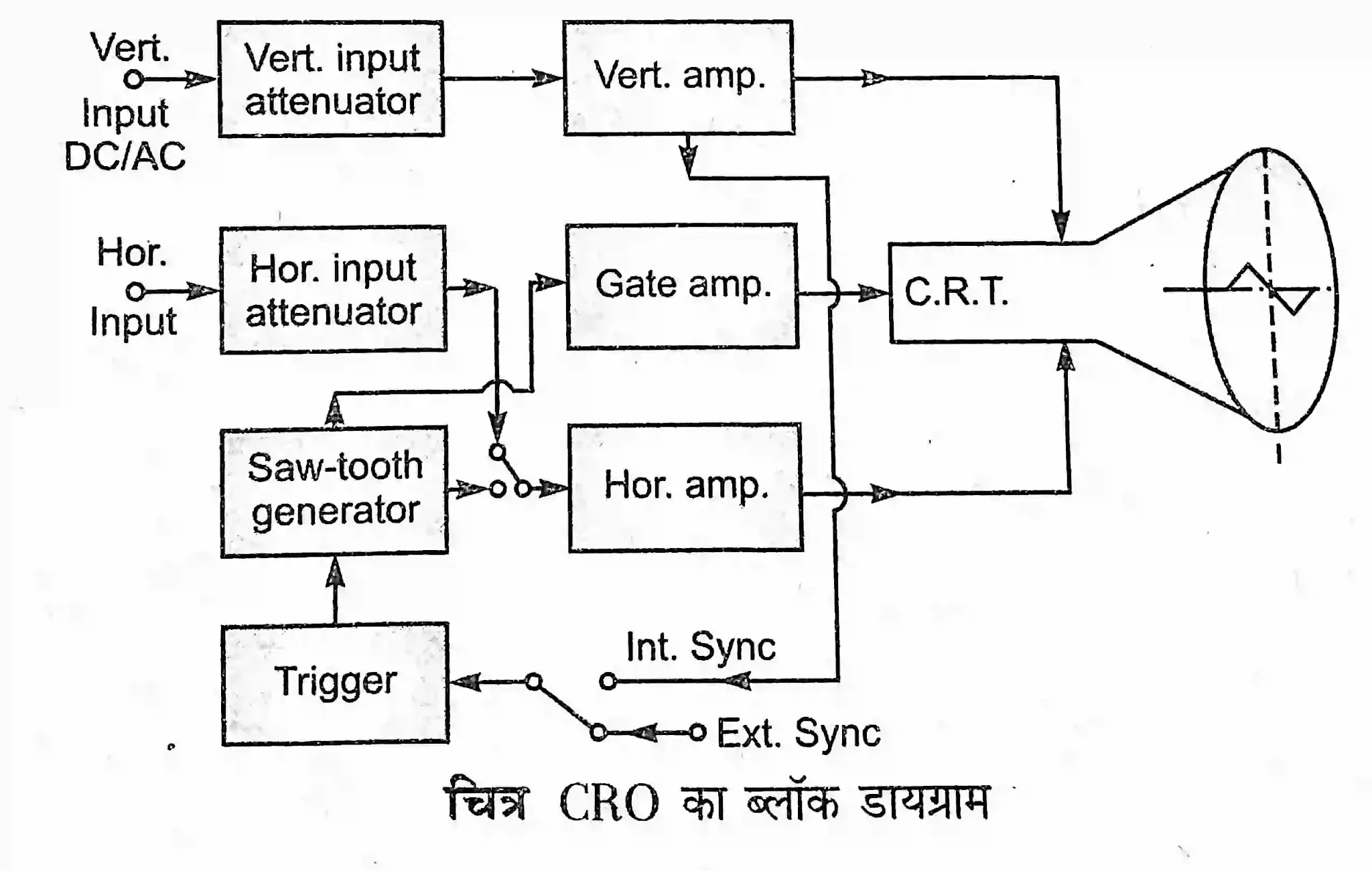 प्रत्येक CRO निर्माता अपने द्वारा निर्मित यन्त्र में भिन्न – भिन्न स्थतियों में लगाता है । चित्र में सामान्य पैनल कन्ट्रोल्स तथा उनकी स्थितियाँ दर्शायी गई है । मुख्य कन्ट्रोल्स का कार्य इस प्रकार है