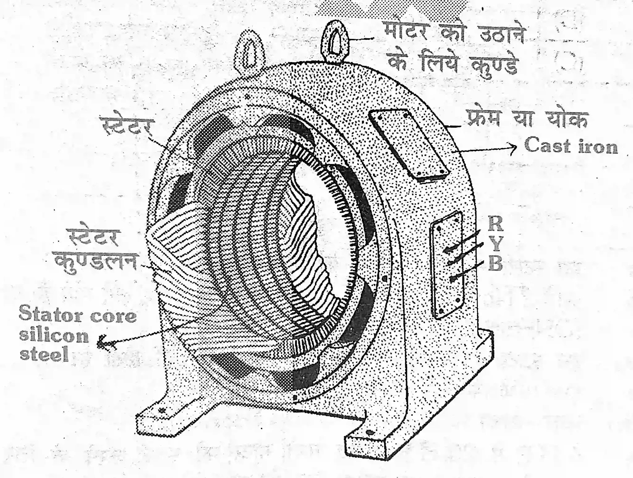 यह मोटर का नहीं घूमने वाला भाग है । स्टेटर में ही अंदर की तरफ से स्टेटर कोर लगाये रहते है जो सिलिकॉन इस्पात ( Silicon Steel ) का बना होता है । स्टेटर कोर को लेमिनेटेड ( 0.35mm to 0.5 mm ) करने से एडी धारा क्षति कम होती है तथा सिलिकॉन इस्पात का हिस्टेरेसिस गुणांक कम होने के कारण हिस्टेरेसिस क्षति कम होती है । स्टेटर कोर पर ही 3 – Phase स्टार या डेल्टा winding की जाती है । जिसके दूसरे सिरे से मोटर को 3 – Phase A.C. सप्लाई दी जाती है । स्टेटर को ए.सी. सप्लाई देने से वह घुमने वाला चुम्बकीय क्षेत्र स्थापित करता है ।घूमने वाले चुम्बकीय क्षेत्र की घूर्णन गति तुल्यकालिक गति ( Synchronous speed ) कहलाता है जिसे N , से निरूपित करते है ।