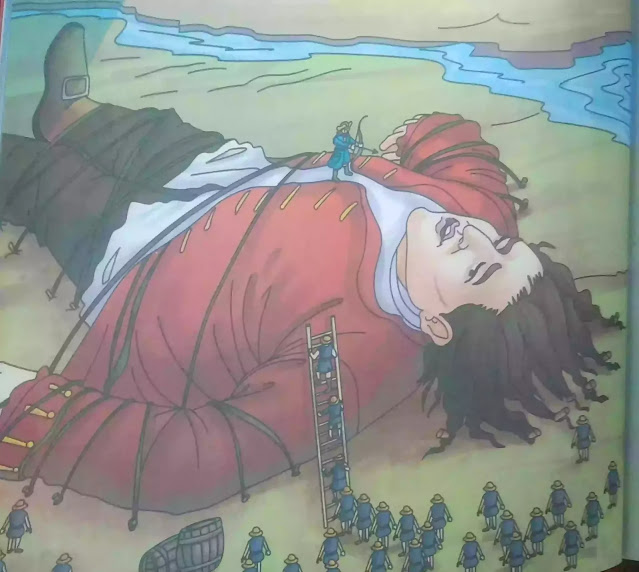जब उसकी नींद खुली तो उसने अपने आपको पतले-पतले धागों में बँधा हुआ पाया। उसके अचरज की तब सीमा न रही, जब उसने देखा कि उसकी छाती पर लगभग छह इंच का एक आदमी खड़ा था। इतना छोटा आदमी उसने पहली बार देखा था।